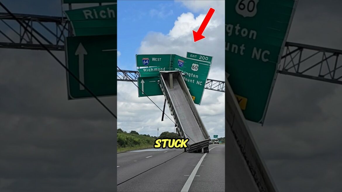 While this guy was driving on the highway, something bizarre caught his attention. A truck’s trailer had somehow become stuck on a traffic sign, even though the sign was way up above the road! But the real surprise came when they attempted to free it â instead of just dislodging the trailer, the whole sign came crashing down!